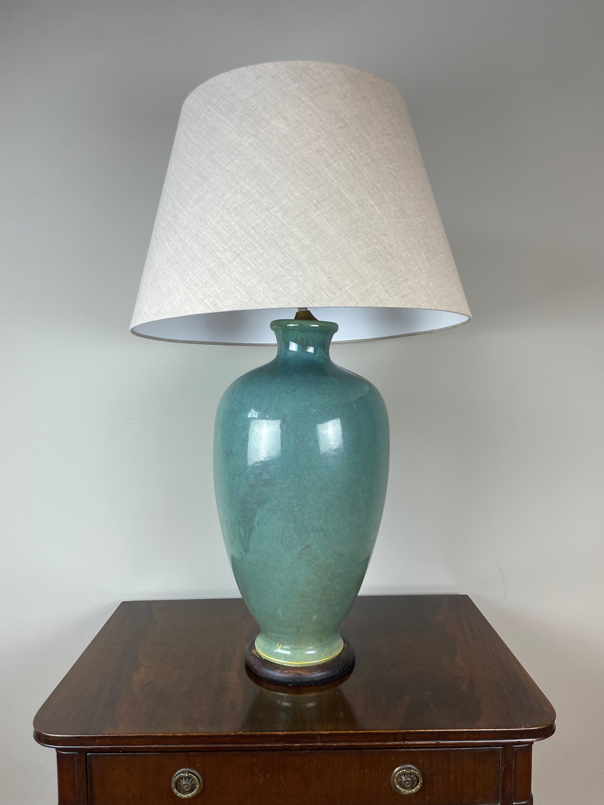 Large urn shaped glazed lamp on wooden base. Recently rewired.