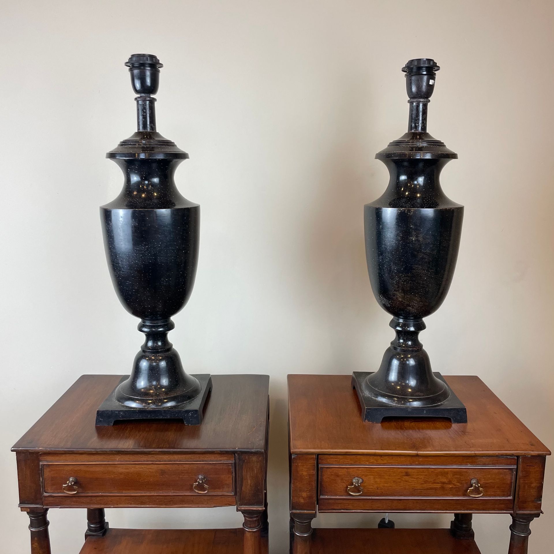 20th possibly 19th century lamps with square base and urn shape. Black