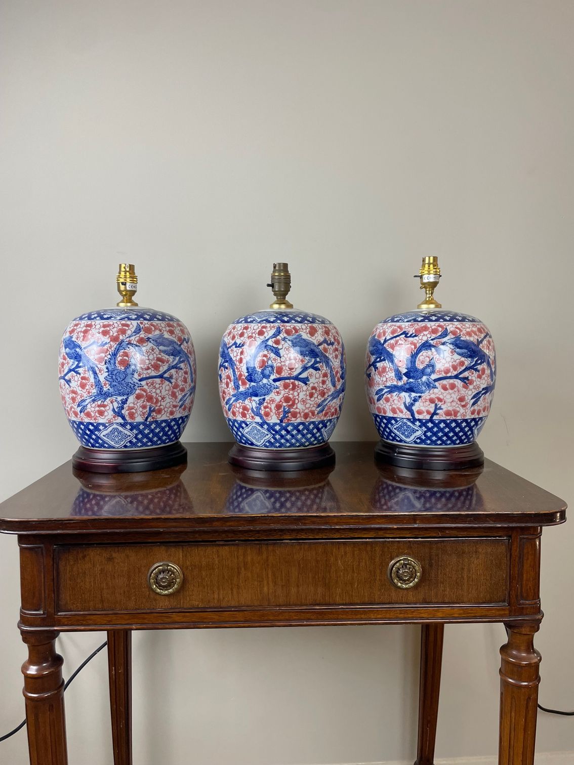 Contemporary set of 3 ceramic lamps with red and blue decoration.
