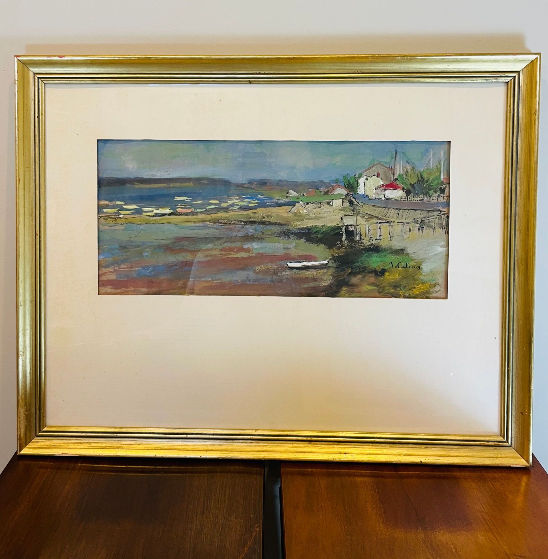 20th Century abstract landscape Oil on canvas. Artist unknown. Possbily french. Good condition. Scratches to painted frame. Would benefit from reframing or repainting existing frame.